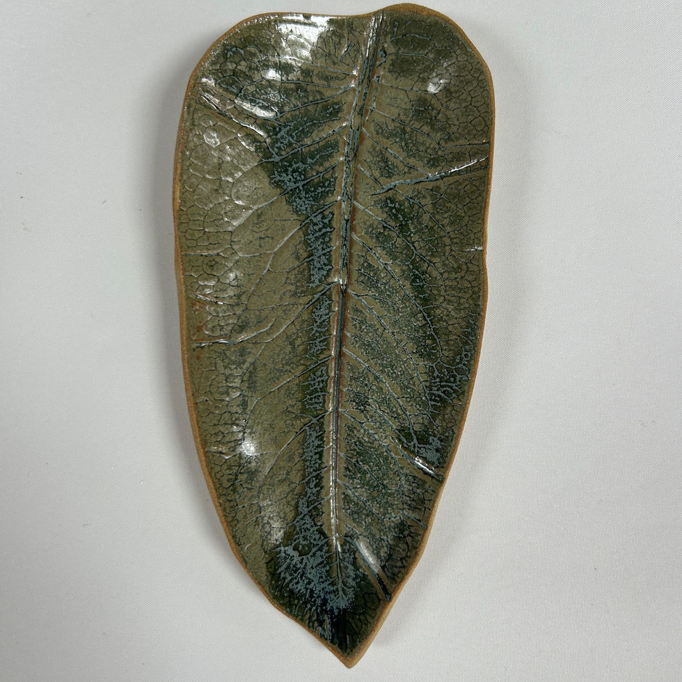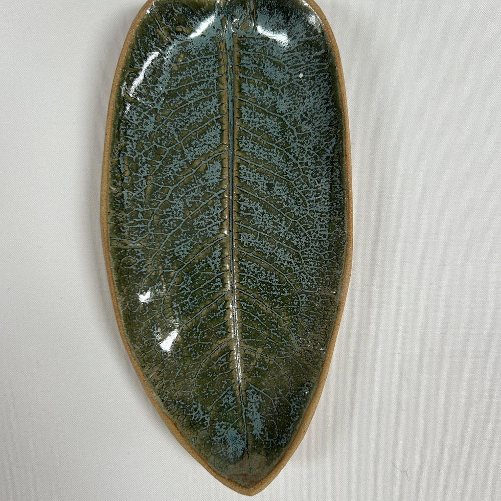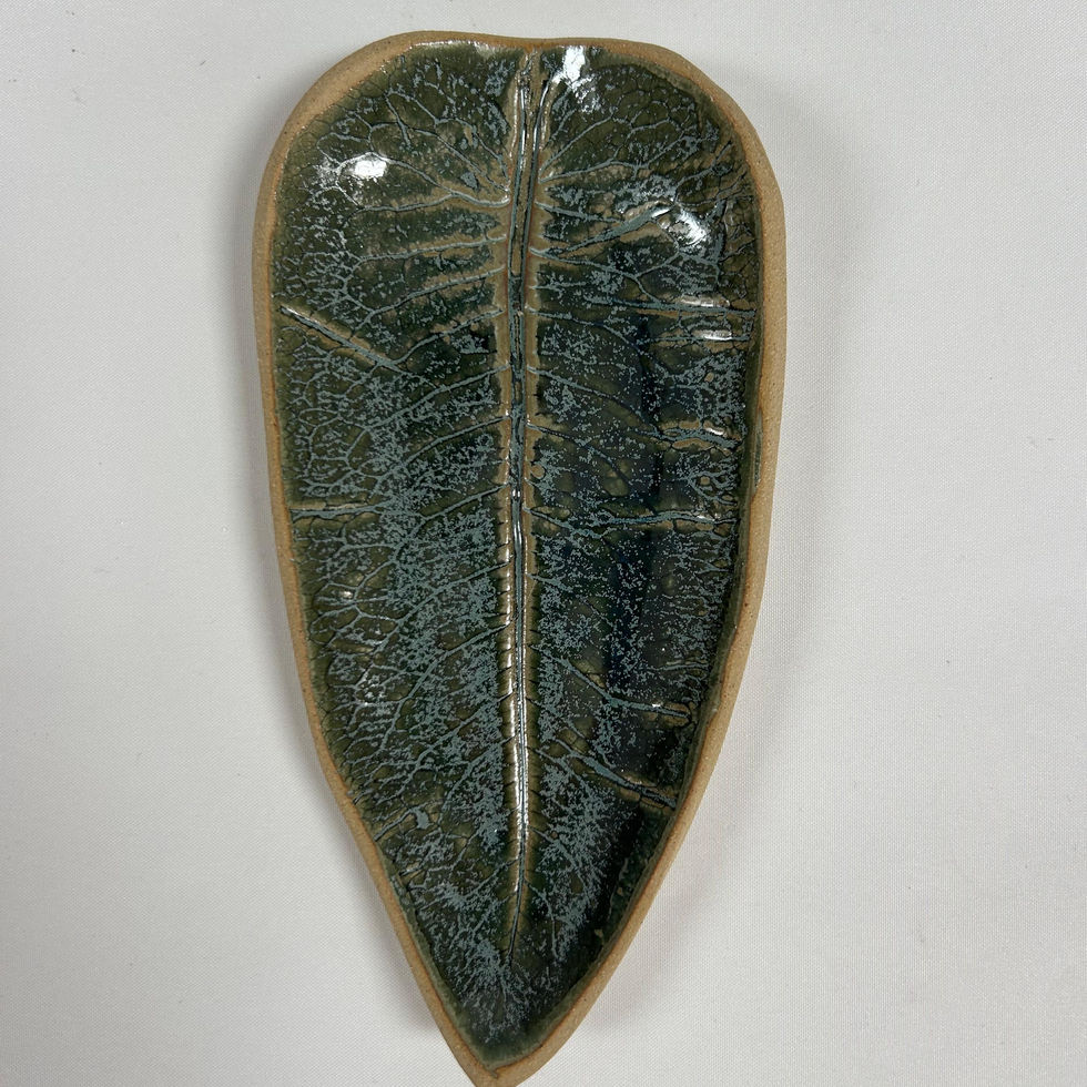 This stoneware leaf dish was hand made and finished with a subtle green/blue glaze.
