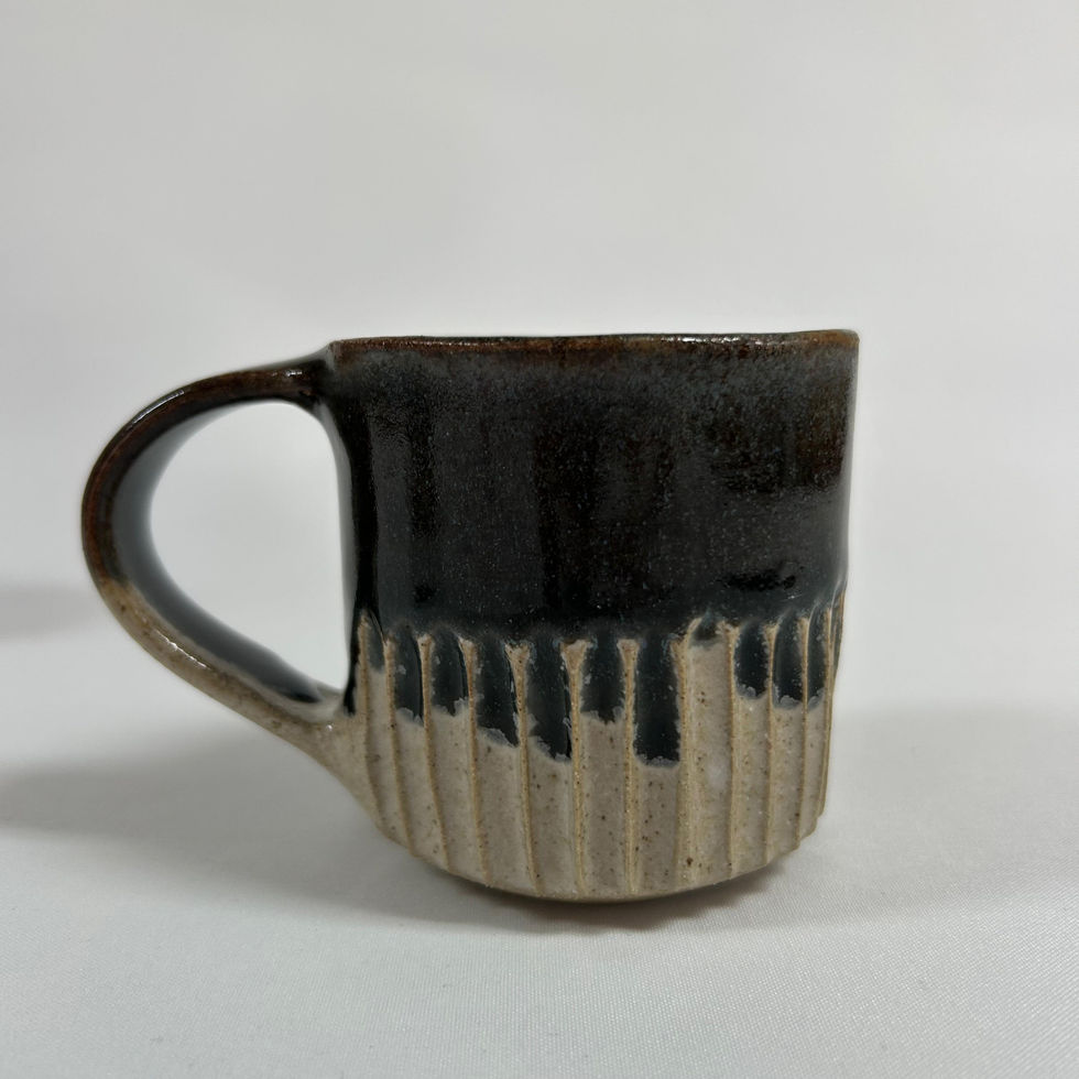 These stoneware espresso cups were wheel thrown and finished with a white and dark blue glaze.